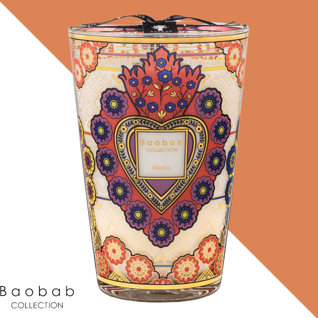 Het glas van de geur-kaars 'Mexico' is bedekt met een zeefdruk op basis van diverse kleuren en goud. Het weerspiegelt een hartvormig offerbeeld. Dit is een klein voorwerp dat spiritueel wordt gebruikt als wensobject of als dankzegging voor een gunst. De motieven komen terug over het hele glas en op de achtergrond is een subtiel broderie motief te zien dat ook terug te vinden is in de Mexicaanse ambachtskunst. Ook met de geur van